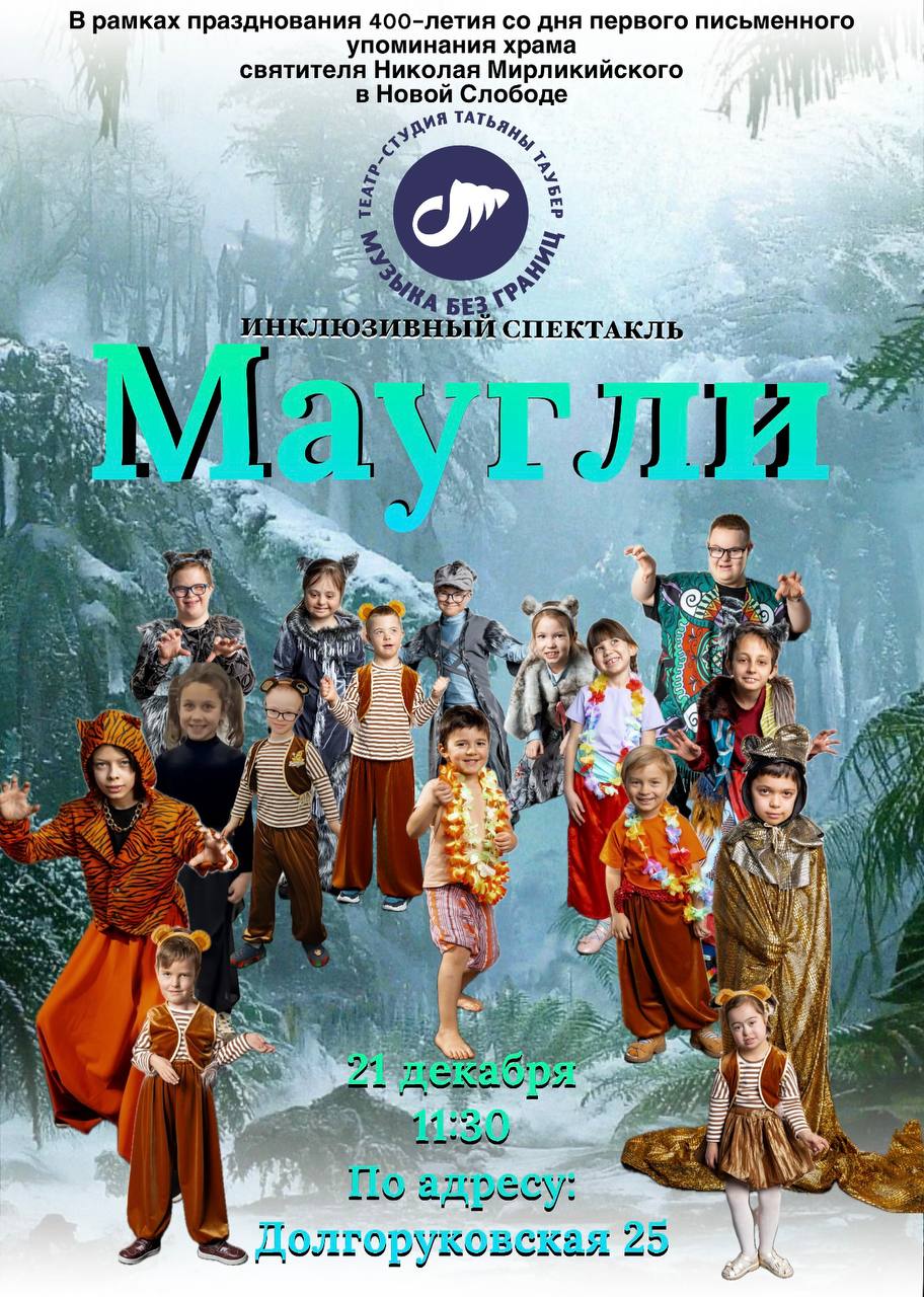 21 декабря в 11:30 в храме святителя Николая Мирликийского в Новой Слободе состоится показ инклюзивного музыкального спектакля «Маугли» в исполнении детей музыкально-театральной студии «Музыка без границ».